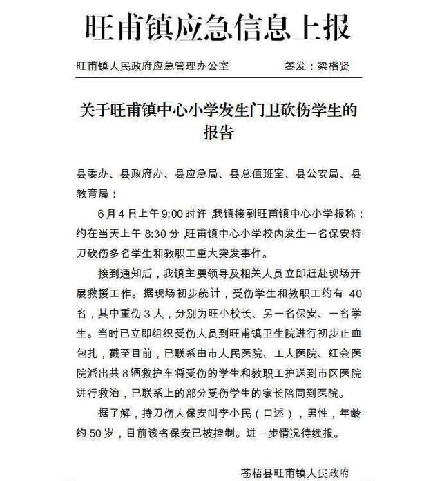 约在2020年6月4日上午8:30分,旺甫镇中心小学校内发生一名保安持刀砍伤多名学生和教职工重大突发事件。 当日12时22分,苍梧县县委宣传部微信公号“今日苍梧”发布通报称,经初步核查,受伤人数39人,其中37人轻微伤,2人伤势稍重,已全部送往医院救治,无生命危险。 一名知情人士此前给予的一份《旺甫镇应急信息上报材料》显示,经初步统计,受伤学生和教职工约有40人,其中重伤3人,分别为旺小校长、另一名保安和一名学生。而持刀伤人者李某某,男性,约50岁。